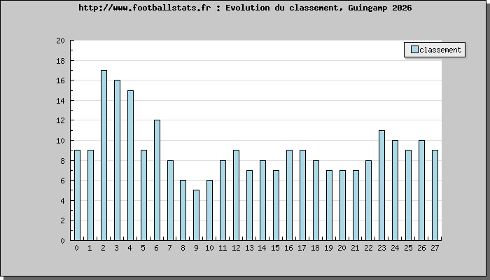 Le meilleur classement de la saison de Guingamp est 5ème. Son plus mauvais classement de la saison est 17ème.