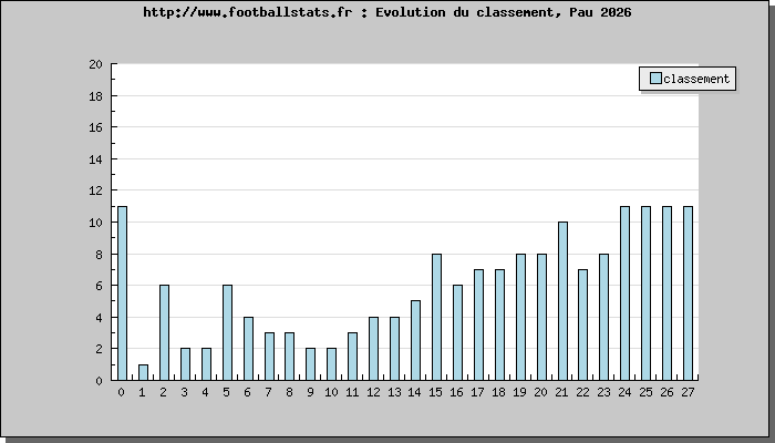 Le meilleur classement de la saison de Pau est 1er. Son plus mauvais classement de la saison est 11ème.