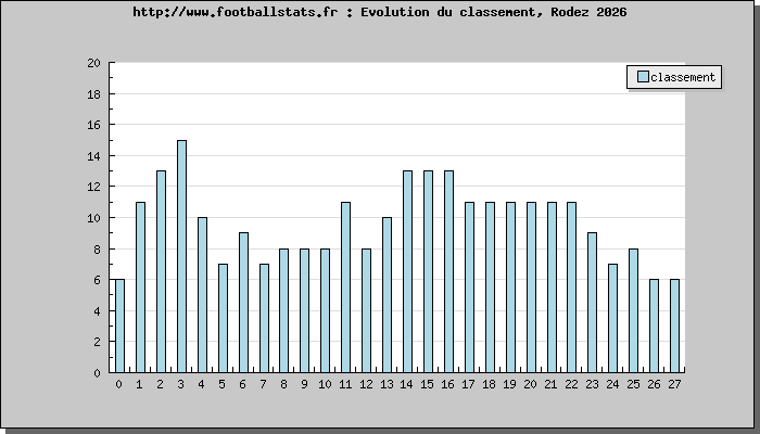 Le meilleur classement de la saison de Rodez est 6ème. Son plus mauvais classement de la saison est 15ème.